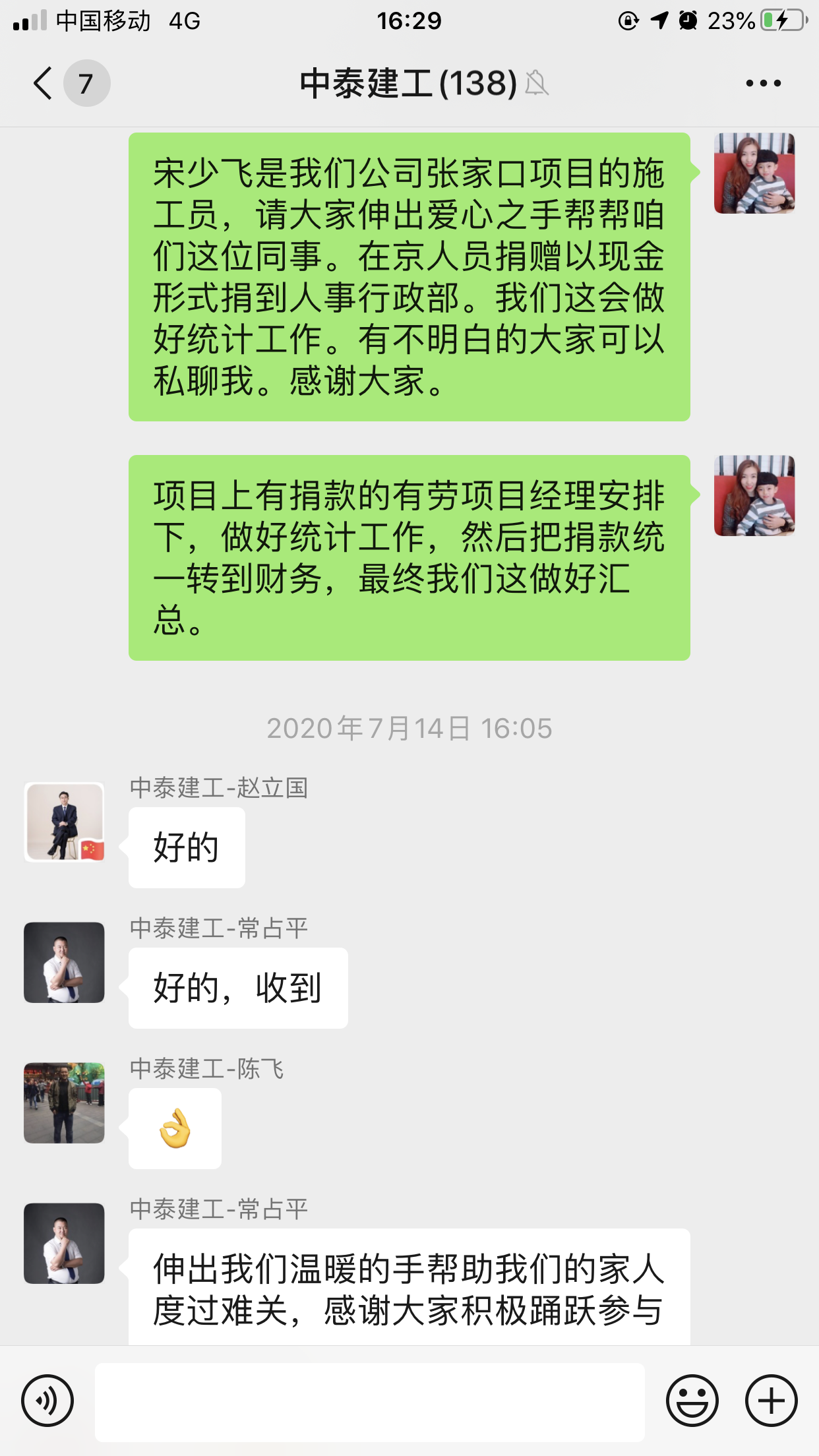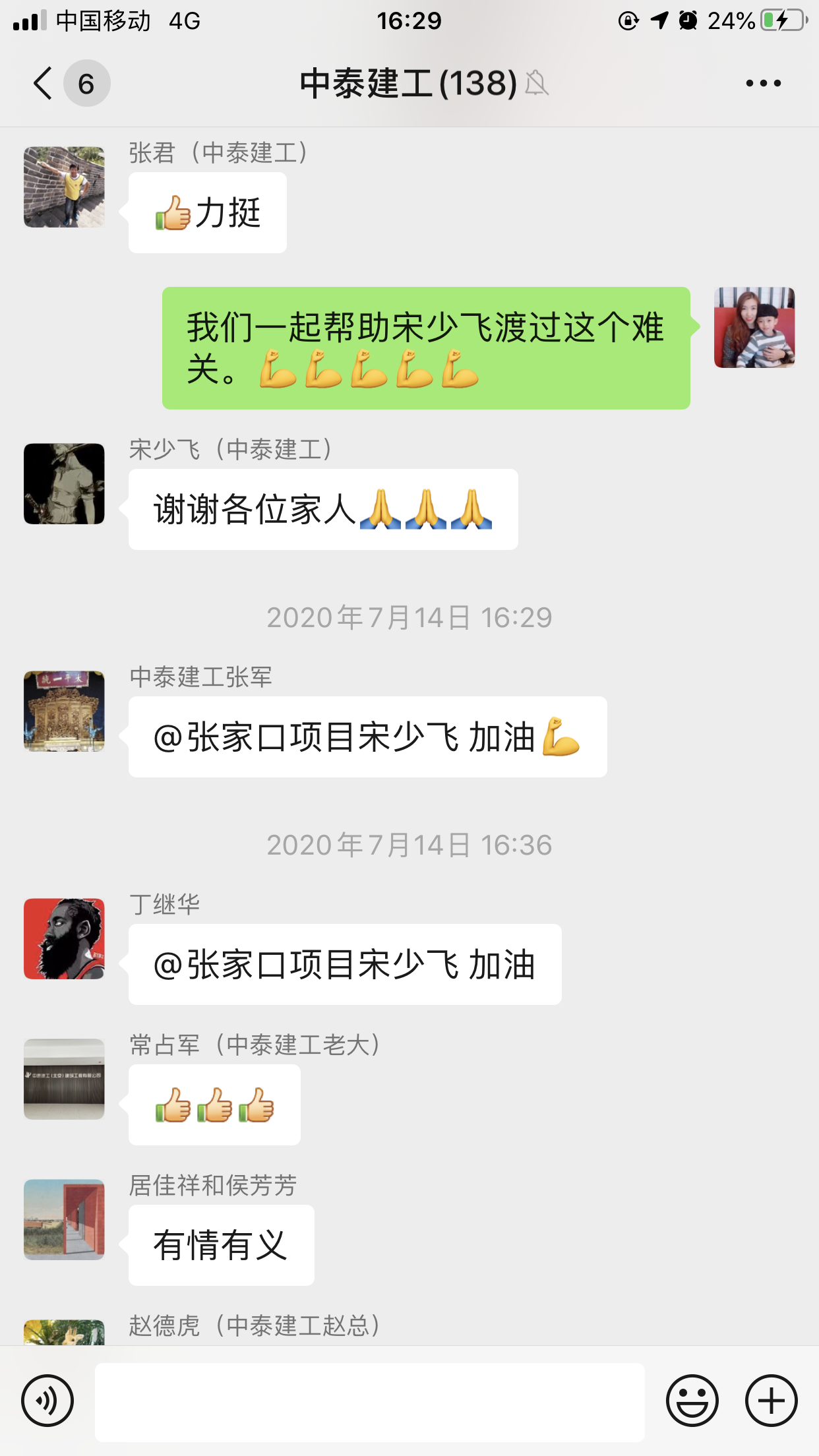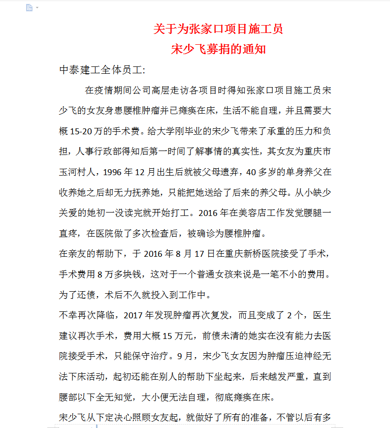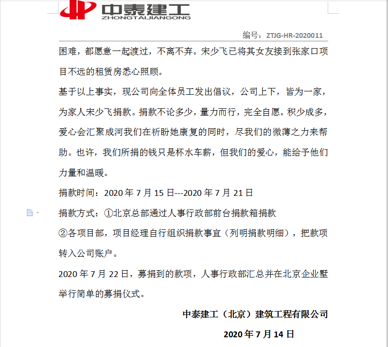 疫情时代(dai),中(zhong)泰建工(gong)(北京)修建工(gong)程(cheng)无(wu)限公司(si)带领访问各名目时,闻悉此情况后,由公司(si)党支部(bu)和工(gong)会牵(qian)头建议建议了为员工(gong)宋少飞捐(juan)献的(de)勾(gou)当,号令全(quan)部(bu)员工(gong)伸出💖增(zeng)援之手(shou)。