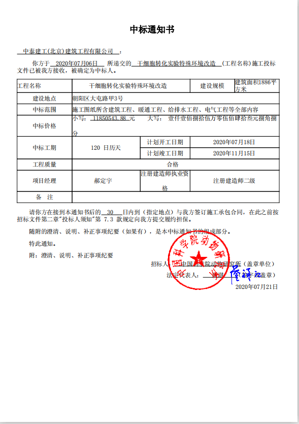 中泰建工喜信不时,喜报连连,成功中标「中国迷信院植物研讨所干细胞尝试室污染工程名目」。